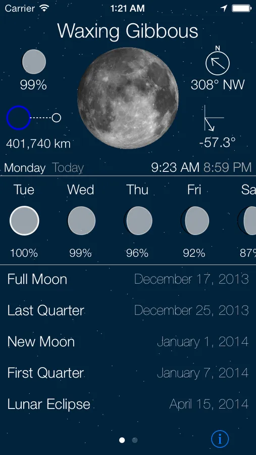 Moon also allows you to research information about the moon at ANY date in past or in the future. You could look up what the lunar phase will be on, say, your birthday...in 10 years.