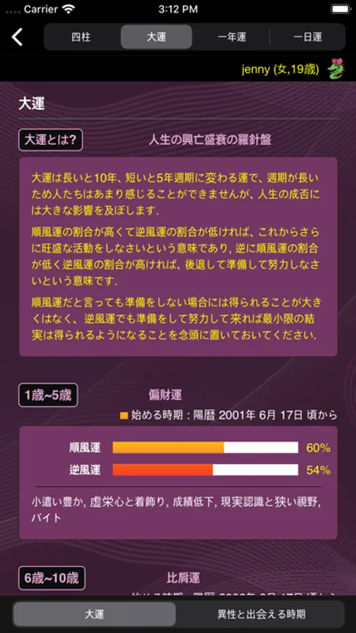 2. 一生の大運を正確な時期まで計算して、時期別でどんな意味があるのか、簡単な解釈とグラフで吉凶を表示。