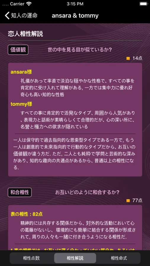 1. 性格、適性、 職業、 異性、 財物、 縁について簡潔な解釈と多様な性格的特性をグラフで表示。