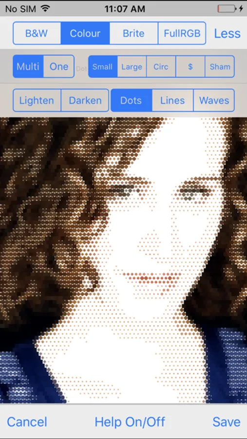 With natural color and brite comix color, and options to brighten/darken the results. Now with horizontal lines mode, Waves (wavy line) mode, one dot size option (more like "pop art") instead of a greyscale of dots, and large dot option. The one dot size works best with one of the color options set.