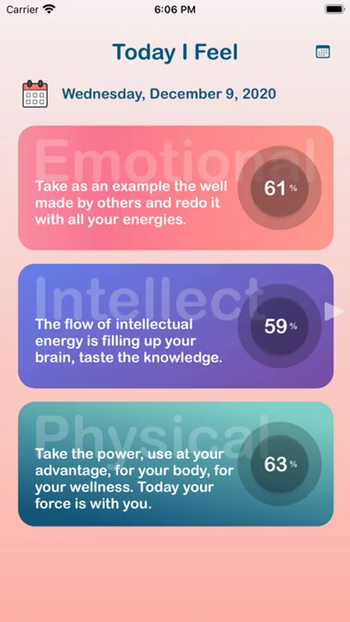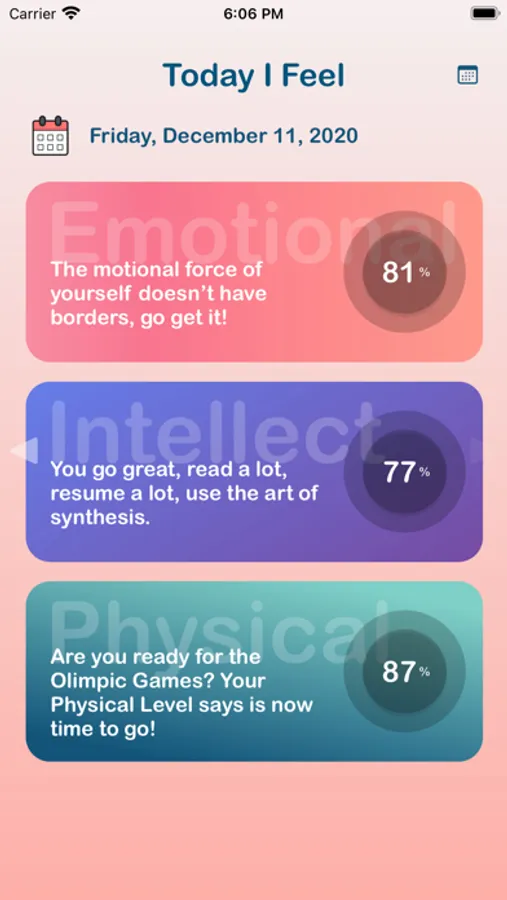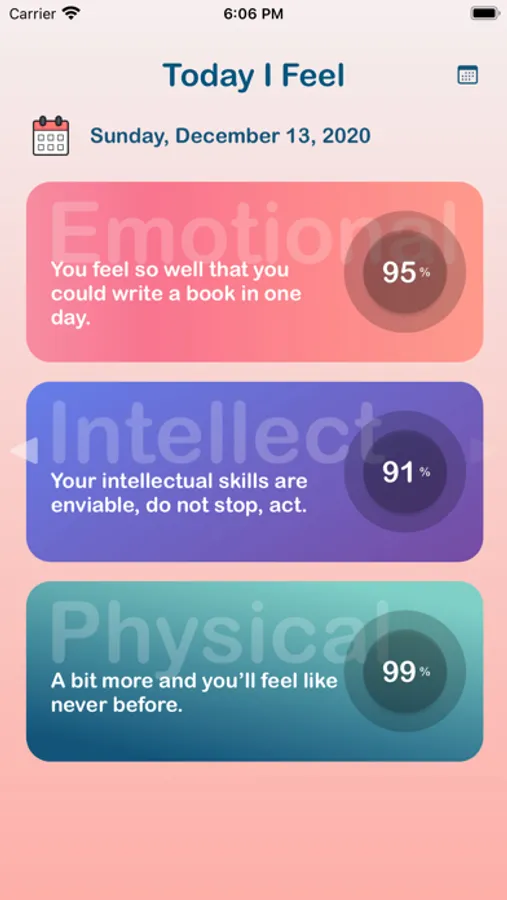 No Magic Balls, No Random Responders, discover really how do you feel. Remember to check your status and your daily horoscope every day, the results of your physical, your emotional and your intellect state, may change every day.