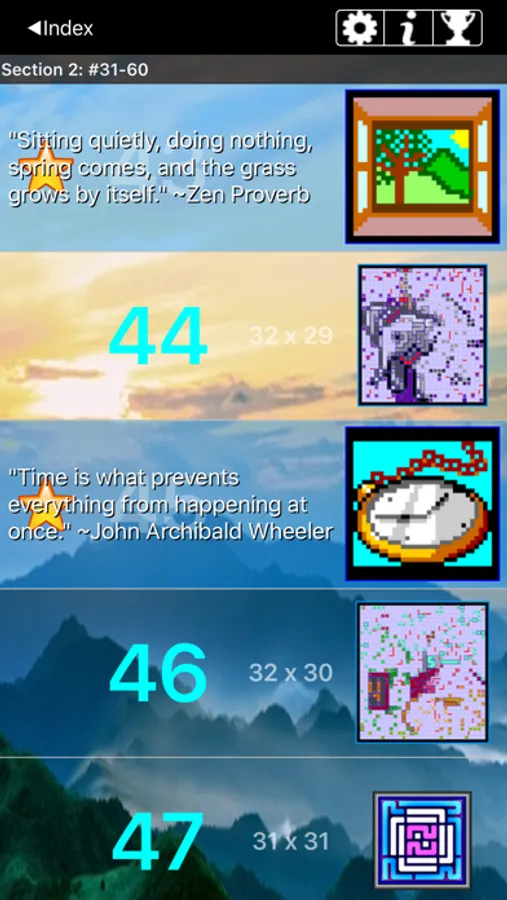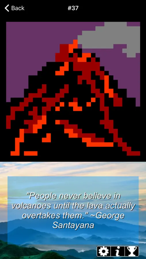 Finish solving to see the miniature picture that you have created. As an extra reward you get a quote related in some way to the picture. Witty or wise, it will give you a little something to think about as you go on to the next puzzle.