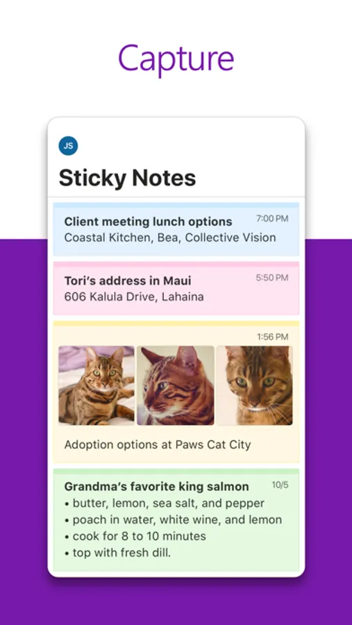 • Quickly save your thoughts and ideas with colorful sticky notes on the go.