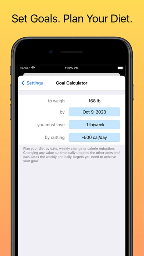 * Goal calculator helps you plan your diet and set your daily/weekly goals