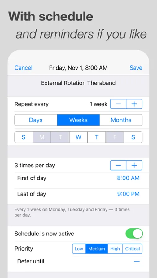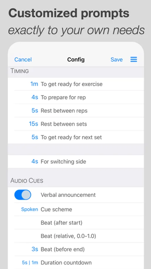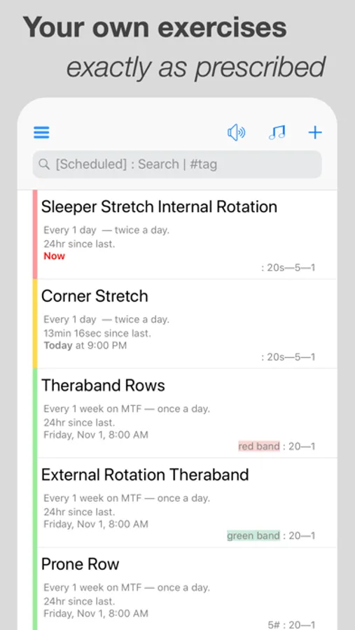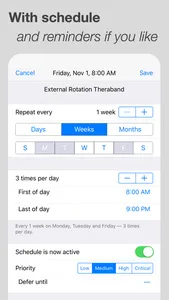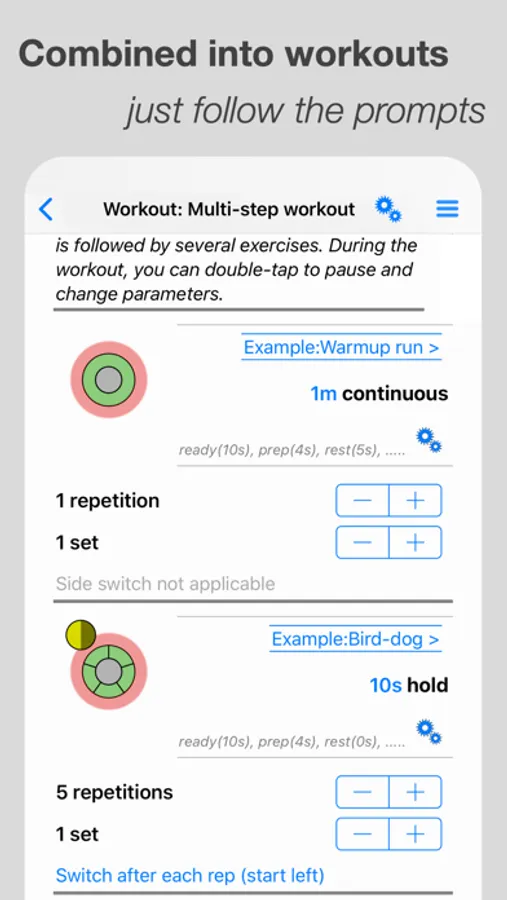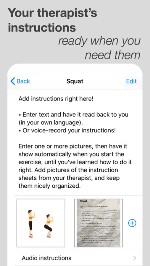 Enter instructions and photos, or a weblink, and setup your entire workout, exactly as prescribed by your therapist. Fine-tune cues and timer settings to fit your own pace perfectly.
