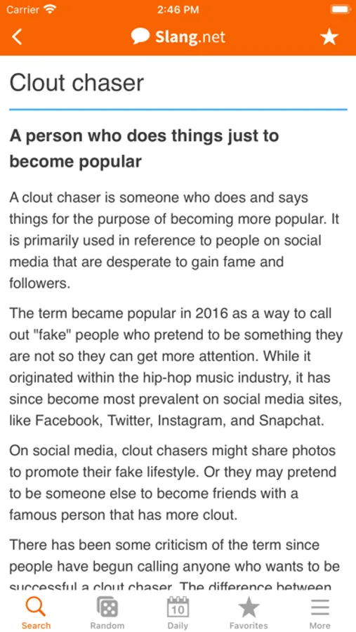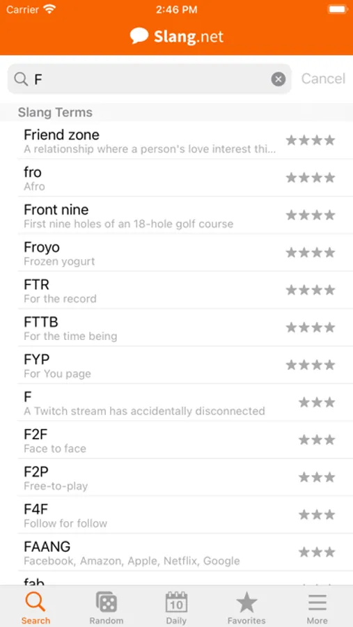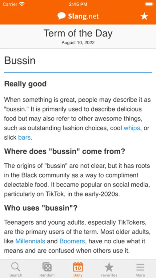 The Slang Dictionary is a free app for iPhone and iPad that allows you to look up thousands of slang terms. Search for the meanings of acronyms, abbreviations, and slang terms. Each term includes a description, an example, and information about how it is used.