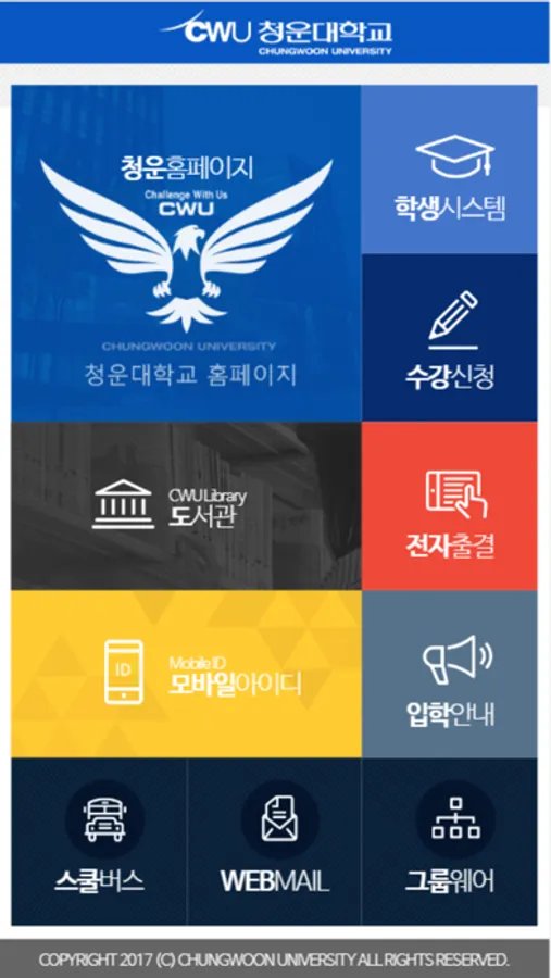 청운대학교 구성원들의 스마트한 생활과 대학홍보를 위하여 제작한 어플리케이션으로 아래와 같은 기능을 제공하고 있습니다.