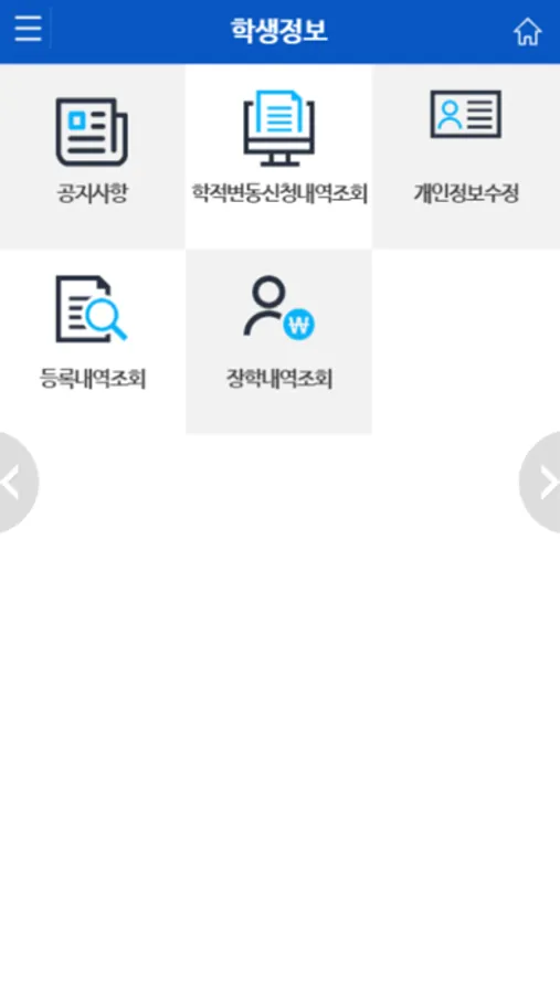 - 학생정보 : 공지사항, 학적변동사항, 등록내역, 장학내역 조회 및 개인정보 수정