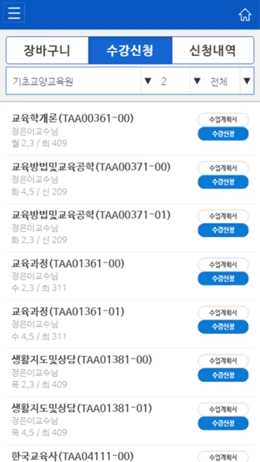 5. 수강시스템 : 학사일정(장바구니수강신청, 수강신청, 계절학기수강신청)에 따른 수강신청 진행 및 수강내역, 강의계획서 조회