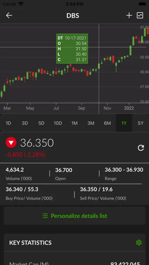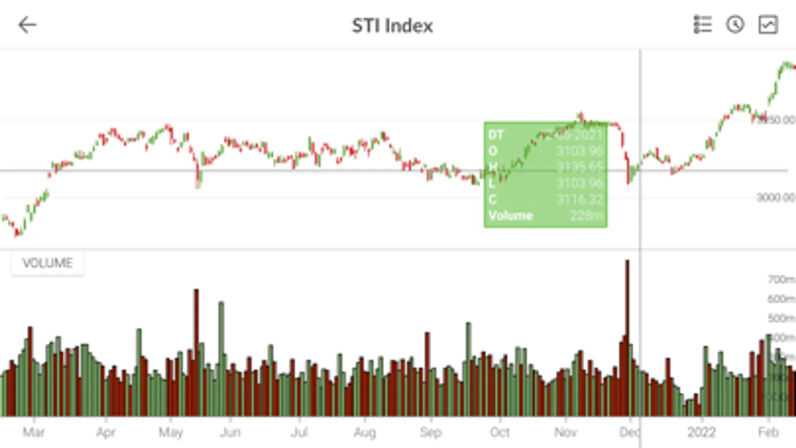 - With popular technical indicators like MACD and RSI at your fingertips, users can view candlestick or OHLC charts of your counters. With selectable time intervals ranging from as short as 5 minutes and time frame of up to 5 years, you can identify trends and anomalies to help you make informed investment decisions.