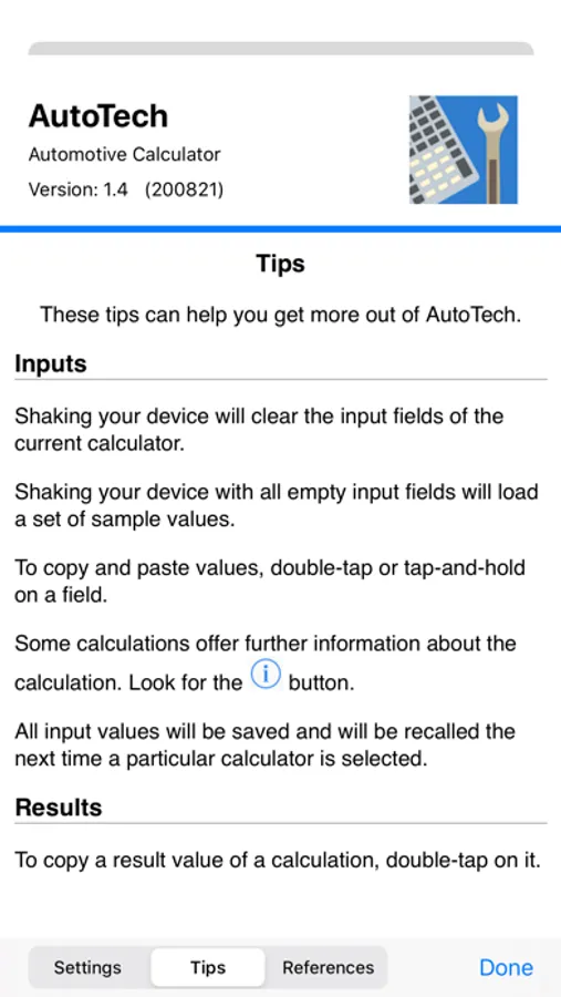 AutoTech is an automotive calculator that offers the mechanic, technician or enthusiast quick computation of 45+ formulas in the areas of aerodynamics, chassis, drivetrain, engine, performance, suspension, and tires. Supports both U.S. and metric units.