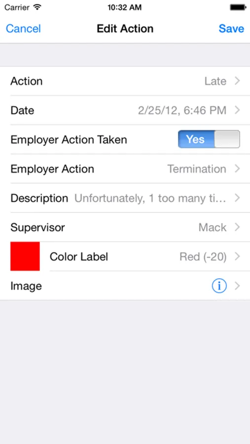 Enter an employee's name, then add infractions/accolades at your convenience. You can customize the app to input just about any actions you want. Change just about any word in the app to fit your needs. The layout was designed to be easy and efficient. When you want to contact the employee, you have all the data you need right in your hands. The app can store the name of the infraction or accolade, the date and time, where it occurred, the supervisor on duty, employer reaction, a photo/image, and a detailed description. Keep in mind this can be done for up to 5 employees in the lite version and an unlimited amount in the pro version. Records can be sent via email- whether it's just one or all the actions a particular employee has earned.