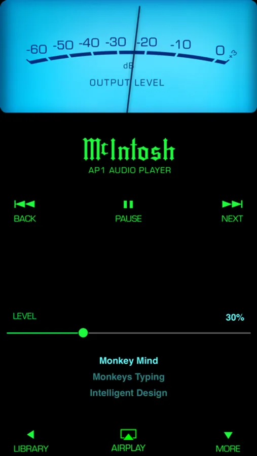 McIntosh Labs is proud to offer the AP1 AUDIO PLAYER. AP1 offers you the ability to listen to the music stored on your iPhone, iPad and iPod Touch within the classic McIntosh experience. Featuring our signature blue meters, AP1 gives you access to your music library in a simple yet elegant interface inspired by the line of McIntosh audio equipment. Depending on a song's file type, the meters will accurately respond to the music level. AirPlay technology is included so you can wirelessly stream your music to an AirPlay compatible speaker system, like the McIntosh McAire.