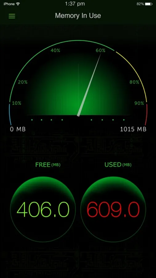 Shows the used and free iPhone memory available as used by other apps. This is shown in an excellent speedometer animation view. Double tap home button, and see other apps in use. Close out the other apps, and see the memory being reclaimed in this app, when the speedometer shows the free memory available increase.