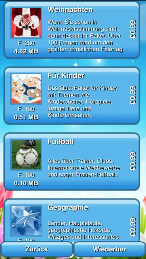 Vergrößere dein Wissen beim Spiel gegen die Zeit mit über 2000 Fragen aus den folgenden Kategorien und mehr: