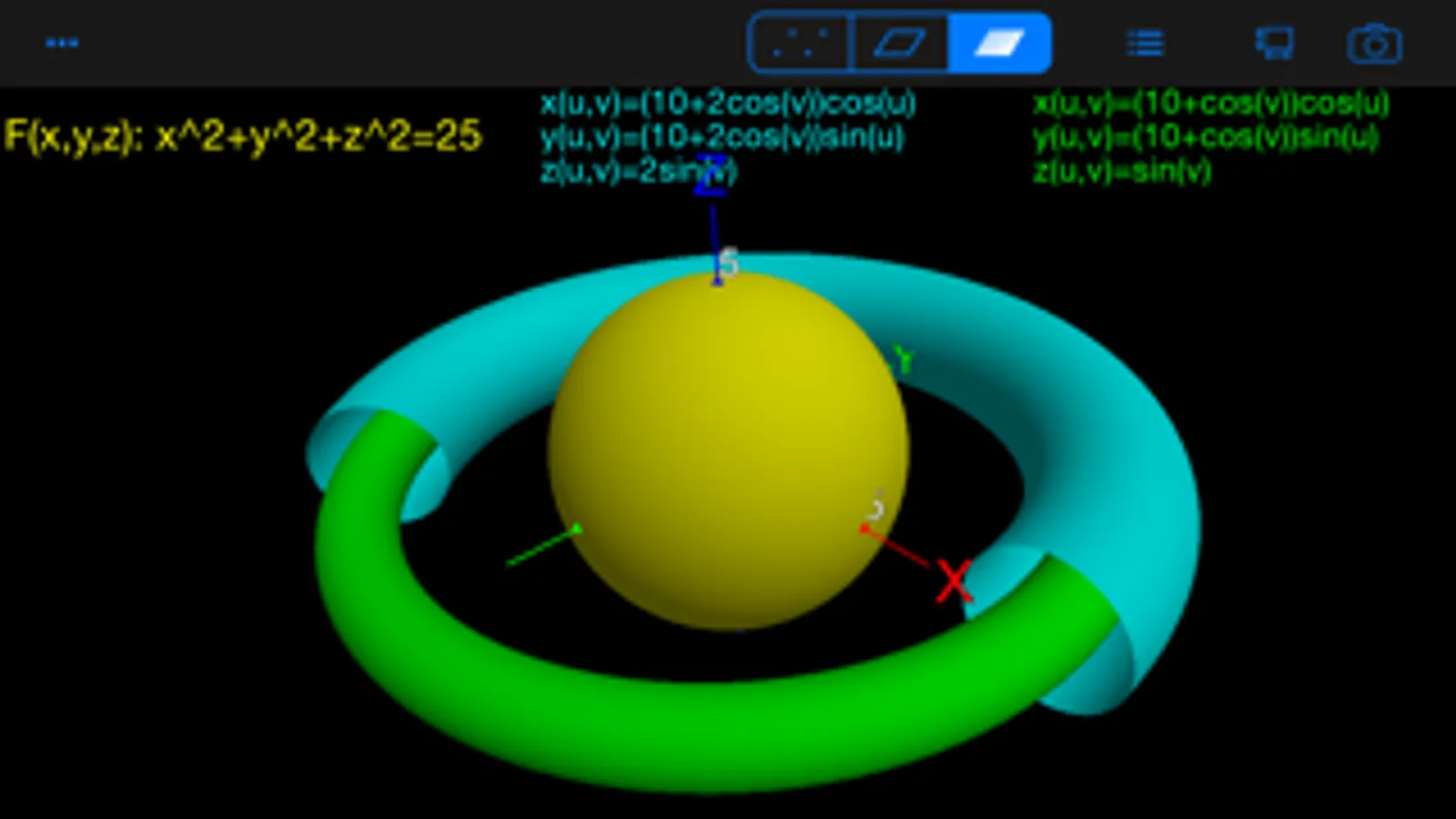 - cartesian x(y,z), y(x,z), z(x,y), cylindrical x(p,φ), y(p,φ), z(p,φ), spherical r(θ,φ), parametric xyz(u,v) and implicit graphs