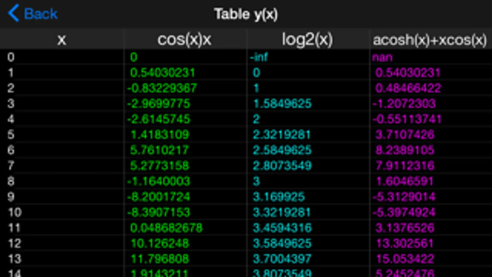 - functions: sin, cos, tan, cot, sec, csc, sinh, cosh, tanh, coth, asin, acos, asec, acsc, atan, acot, asinh, acosh, atanh, acoth, log2, log10, ln, logn(n,x) (log x with base n), √, ³√, abs, avg, ceil, floor, round, deg2rad, rad2deg, max, min, sgn, lcm, gcd, nCr, nPr, arg, real, imag, conj, polar