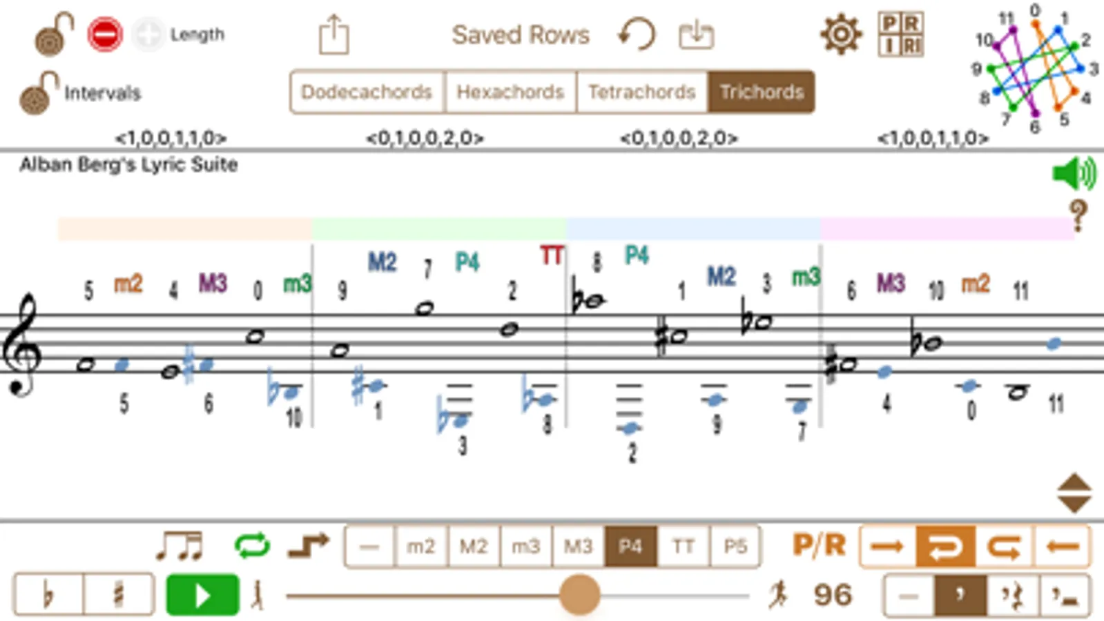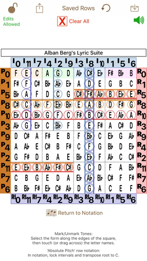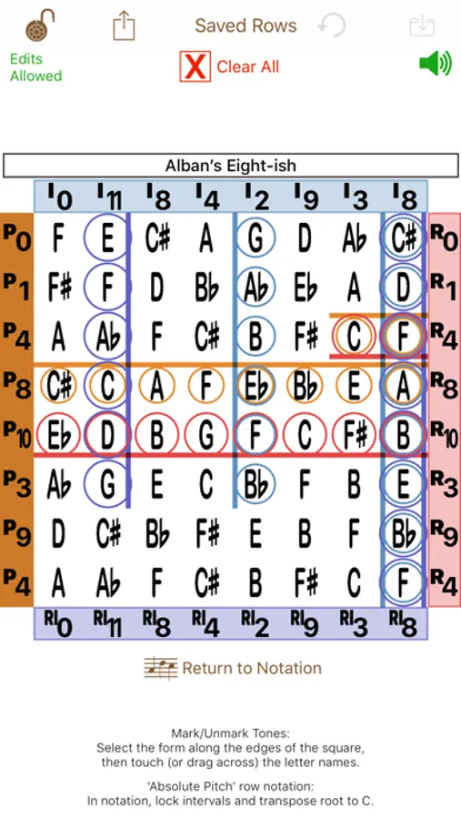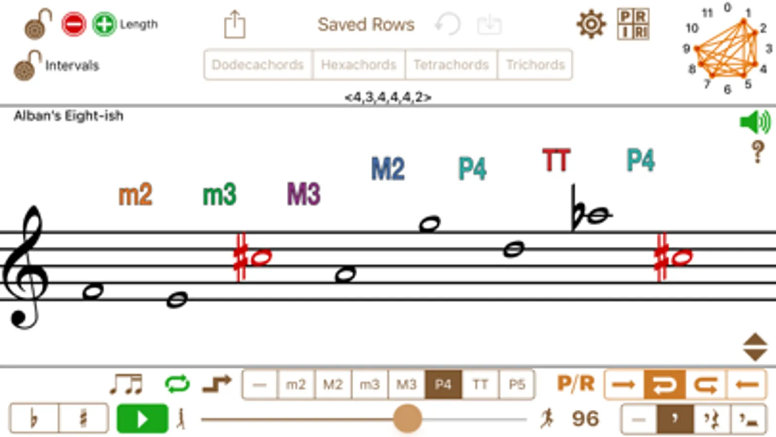• Save your rows (rows may contain from 1 to 12 notes), complete with name and current P, R, I, RI matrix markings. Saved rows appear in a list with their name and midi numbers to help you identify them.