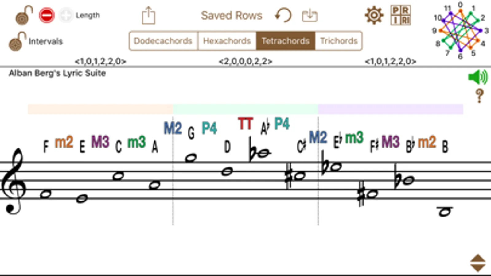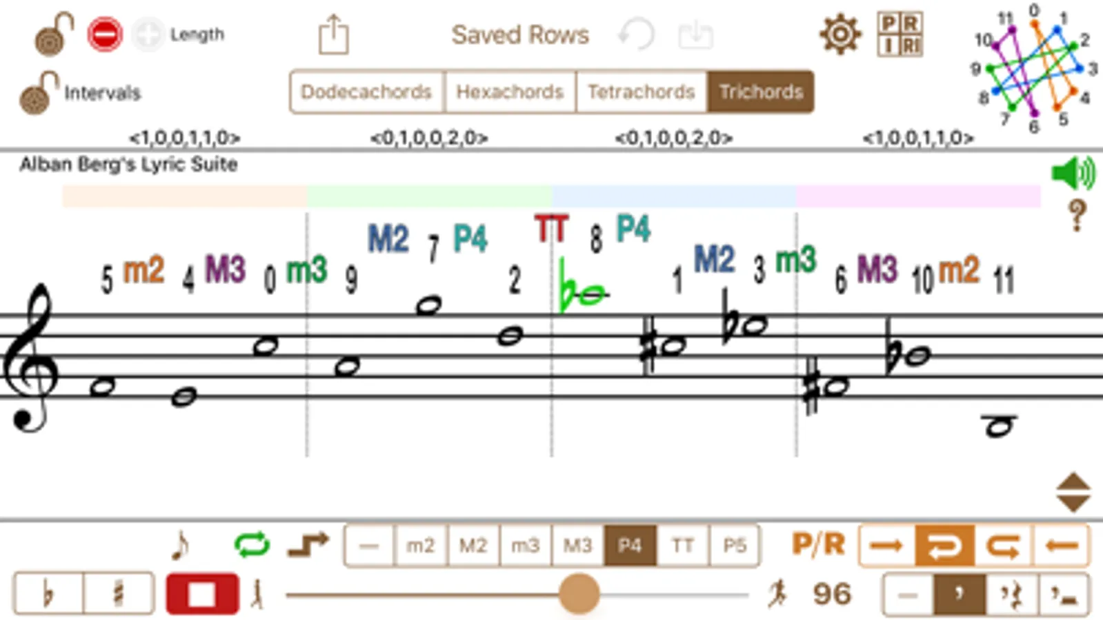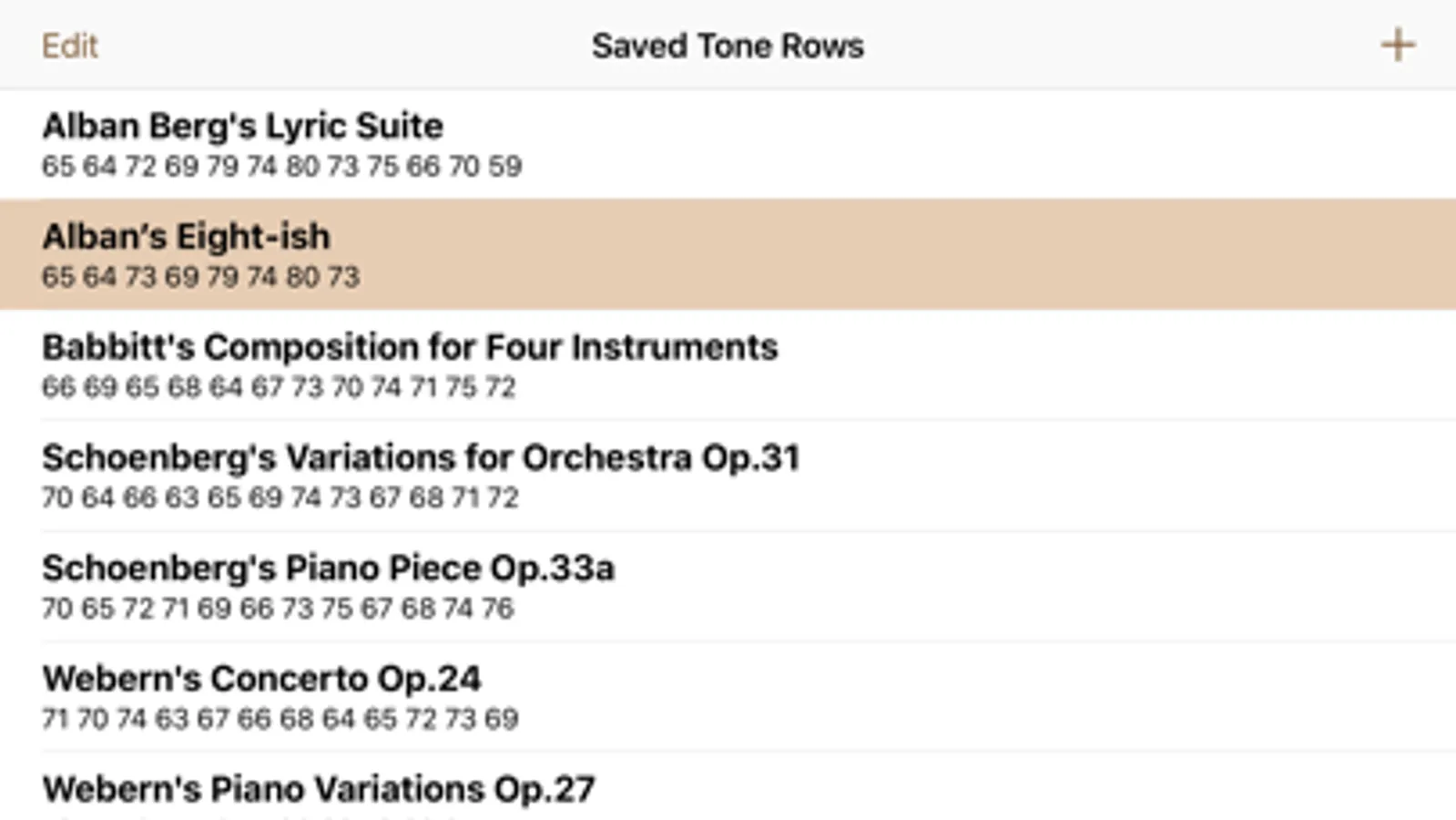 • Save your rows (rows may contain from 1 to 12 notes), complete with name and current P, R, I, RI matrix markings. Saved rows appear in a list with their name and midi numbers to help you identify them.