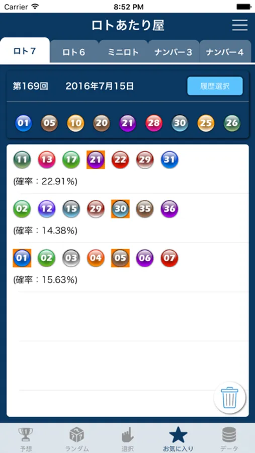 過去の全データを使って、集計して、確率高い番号を予想します。