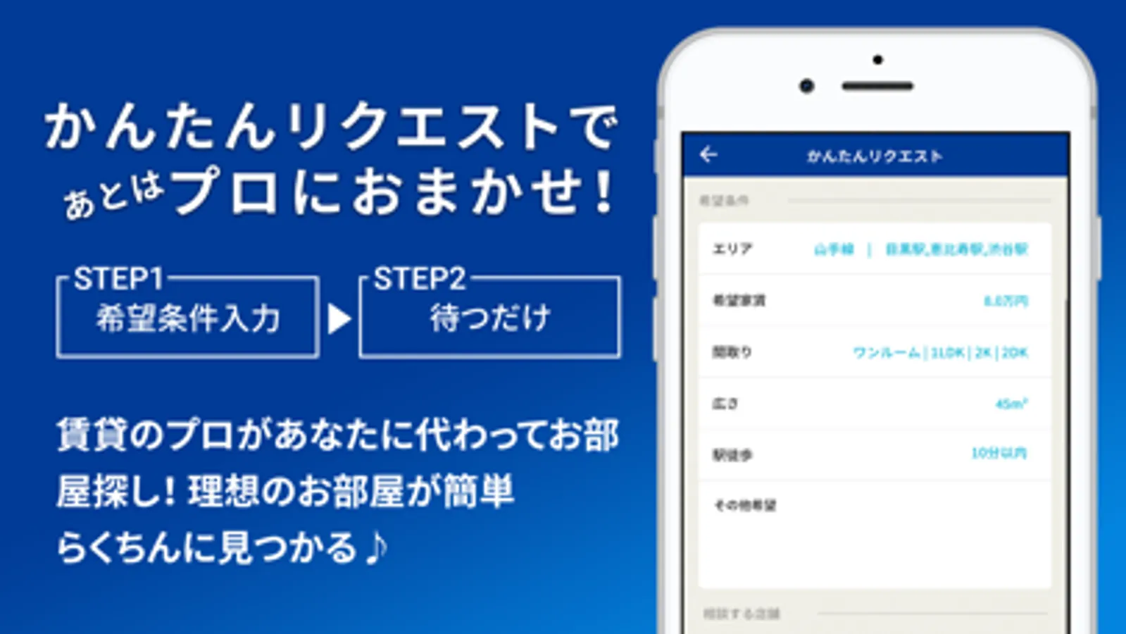 自分で物件を探すのが苦手な方はプロにお任せ! ご希望の条件をリクエストして、あとは待つだけ! 何もしなくても賃貸物件のプロがあなたに合ったお部屋を探してくれます。非公開物件や掲載前の物件情報、地域・エリアのマル秘情報も教えてくれるので一番オススメ! 物件検索が面倒な方にもうってつけです!