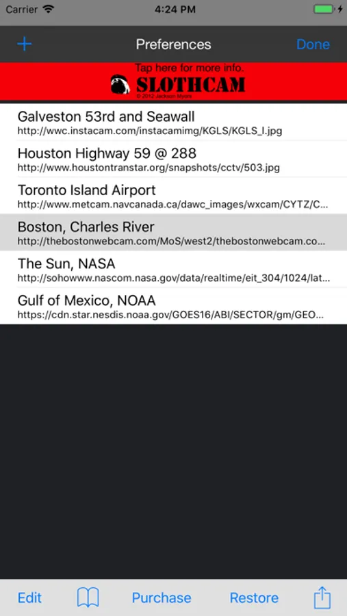 SlothCam comes with a few built in sample webcams, but the purpose of this app is for you to add your own. There is no limit to the number of cams you can add, and this app can be personalized for many possible uses. For example, you can use it to monitor local traffic conditions, check on the weather in your home town, keep an eye on surf conditions, etc.