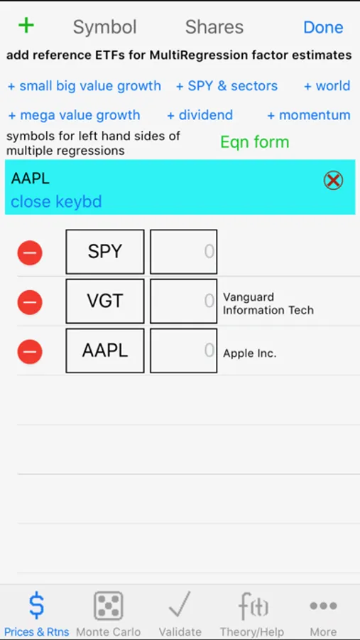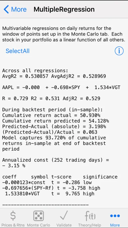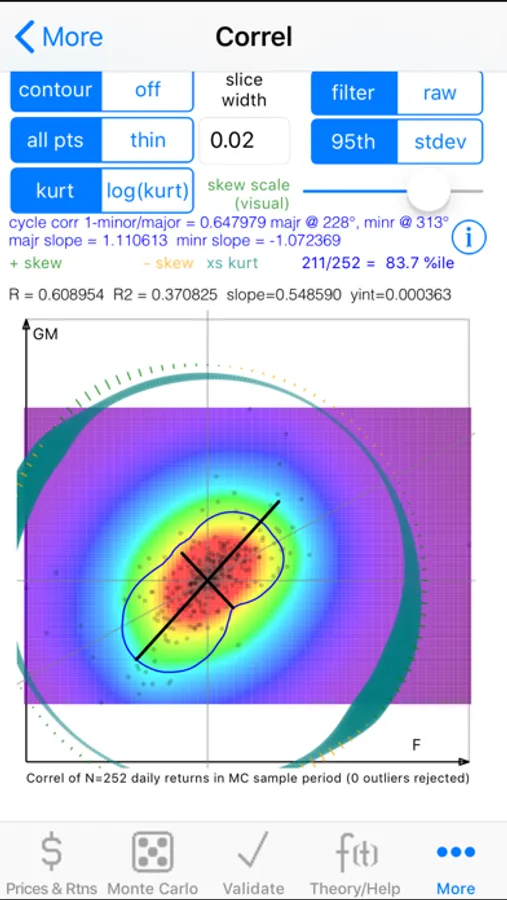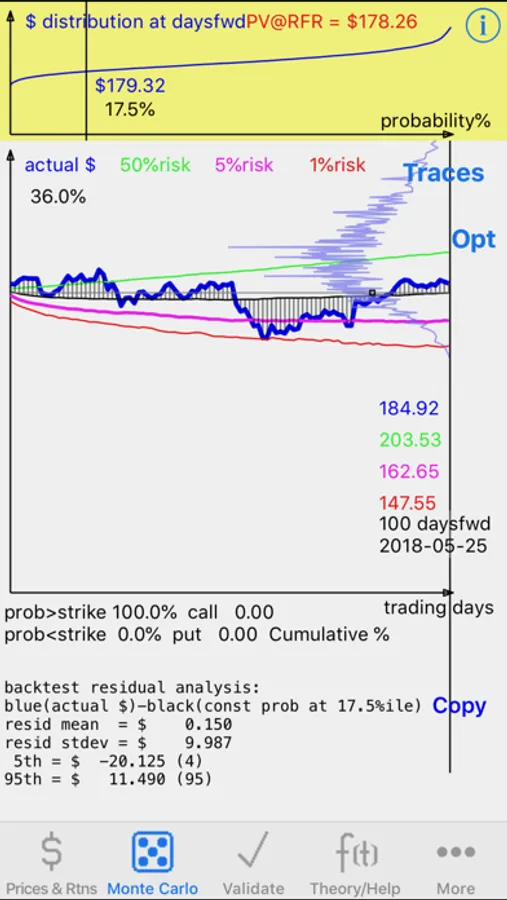 Why rely on the tea leaves of chart reading when you can apply real statistics and historical resampled data to your analysis? While charting tools such as Bollinger bands, moving averages, and candlesticks are generated only on historical data, this app takes past data and remixes it via Monte Carlo methods to generate thousands of possible future price walks, then computes the probabilities of those price outcomes. Also works for stock-like ETFs and short ETFs (e.g. SH = short SPY).