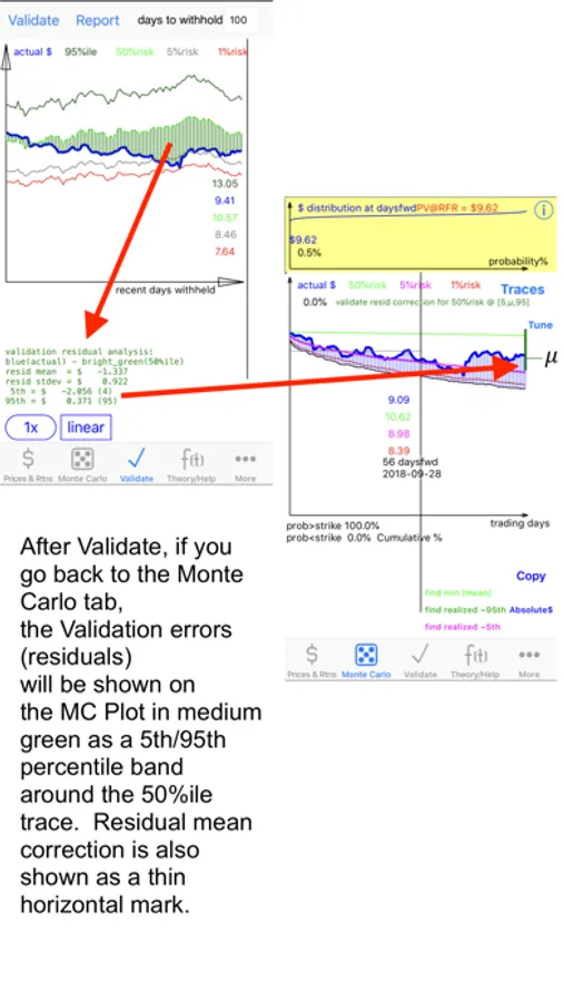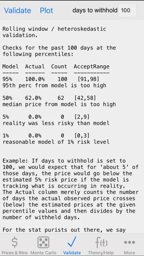 On the Monte Carlo tab, you can withhold any number of recent days from the model and then plot the results of the stochastic risk forecast as lower-bound envelopes at 1% and %5 and all other estimated probability (risk) levels dynamically after the model run is completed.