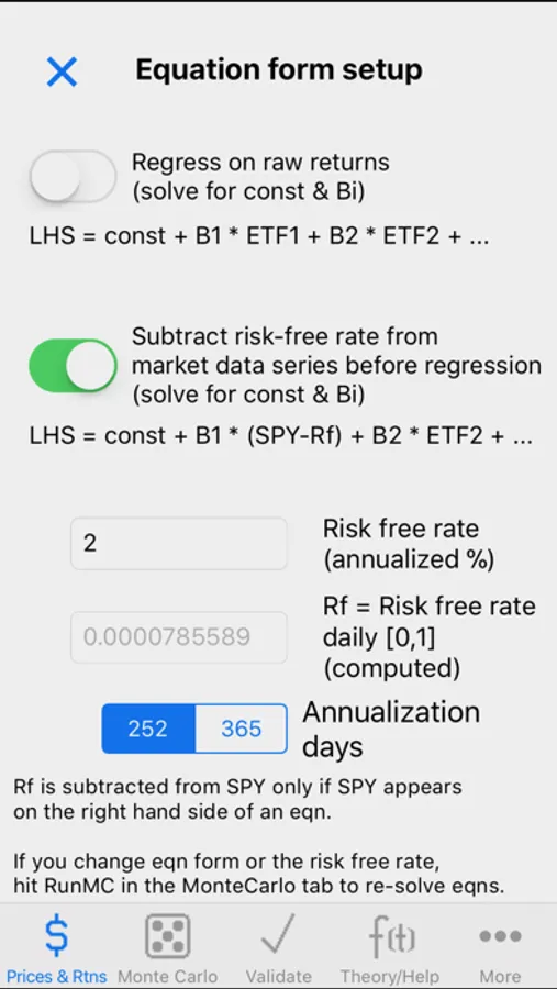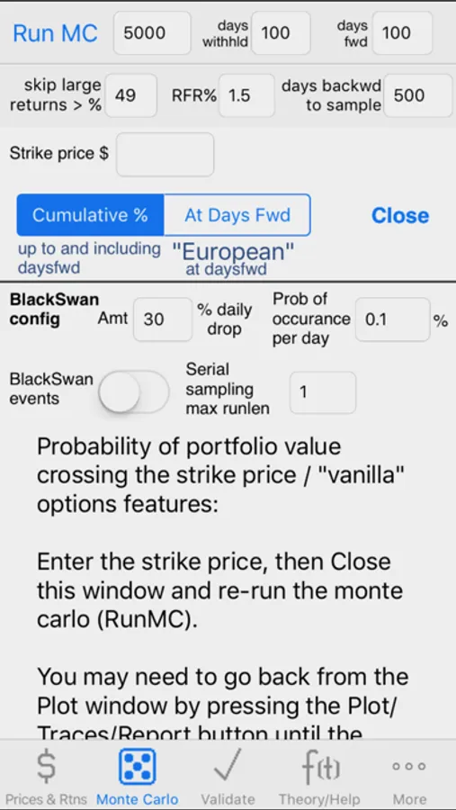 Be sure to press the Run Monte button on the Monte Carlo tab after changing settings or downloading a new data set.