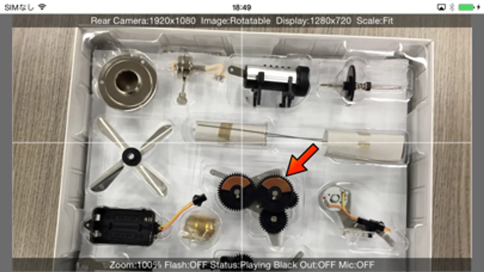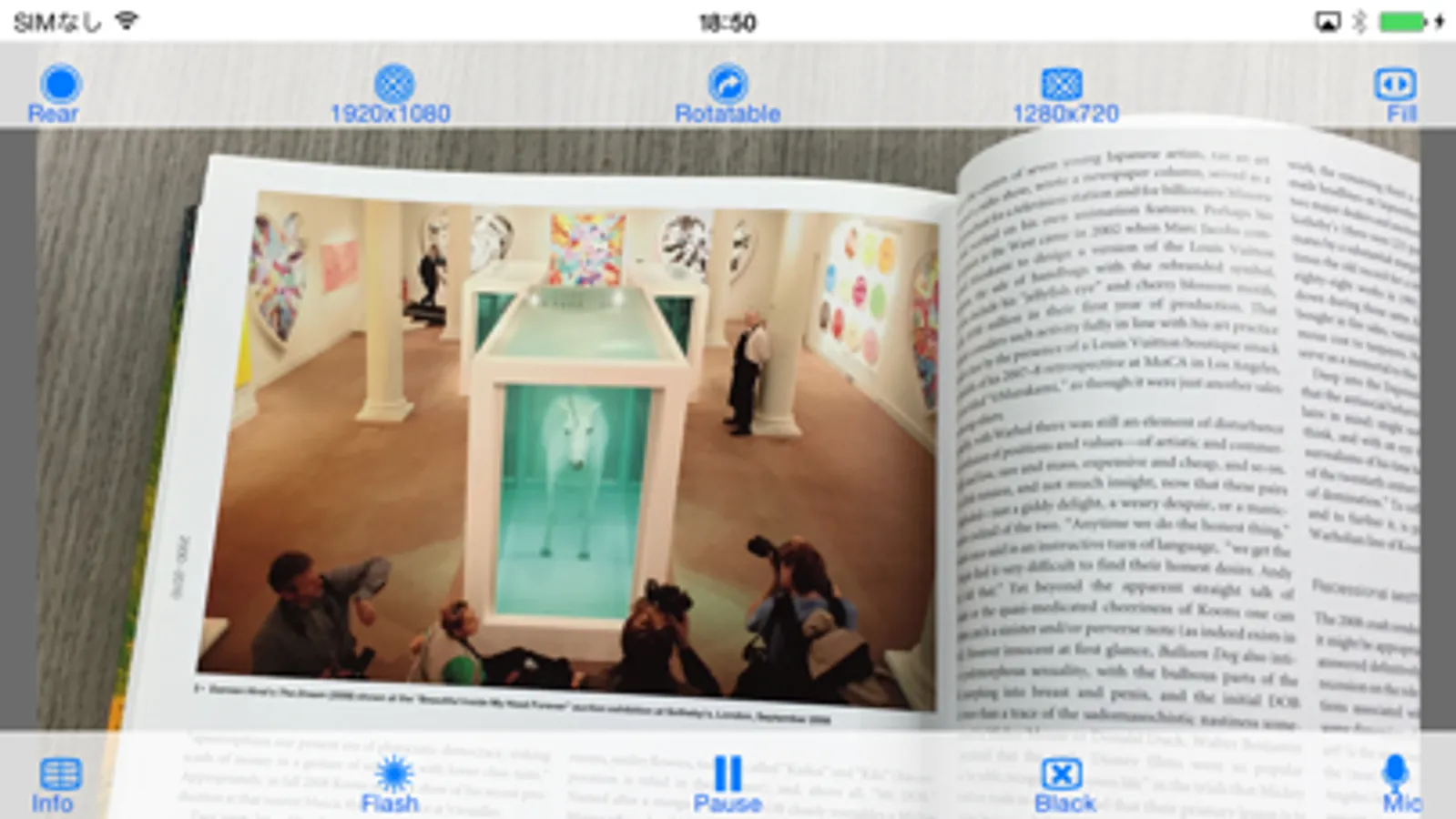 "CameraVision" outputs the images of the built-in camera and the corresponding sounds from the built-in microphone to an external device such as a projector or a TV monitor. This application can be used similar to a "document camera (overhead projector)" or a "live camera" to project documents, objects, people or scenes onto a large screen. In addition, showing a still image from Photo Albums is possible. A dock/Lighting-connector adapter/cable can be used and the wireless transfer to Apple TV (AirPlay) is also supported.