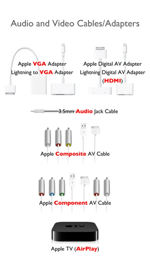 * Microphone input can be sent to an external speaker via HDMI, Composite or Component cable with the camera image. It can be sent wirelessly to Apple TV (AirPlay). When using a VGA cable, plug an audio cable to iPhone's headphone jack.