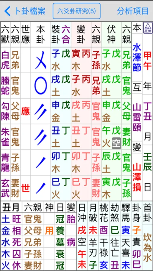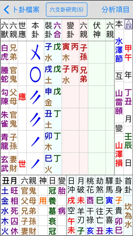 ●本卦六爻:世、應、六獸、六親、天干、地支、空亡、旺相、日辰長生、刑沖。