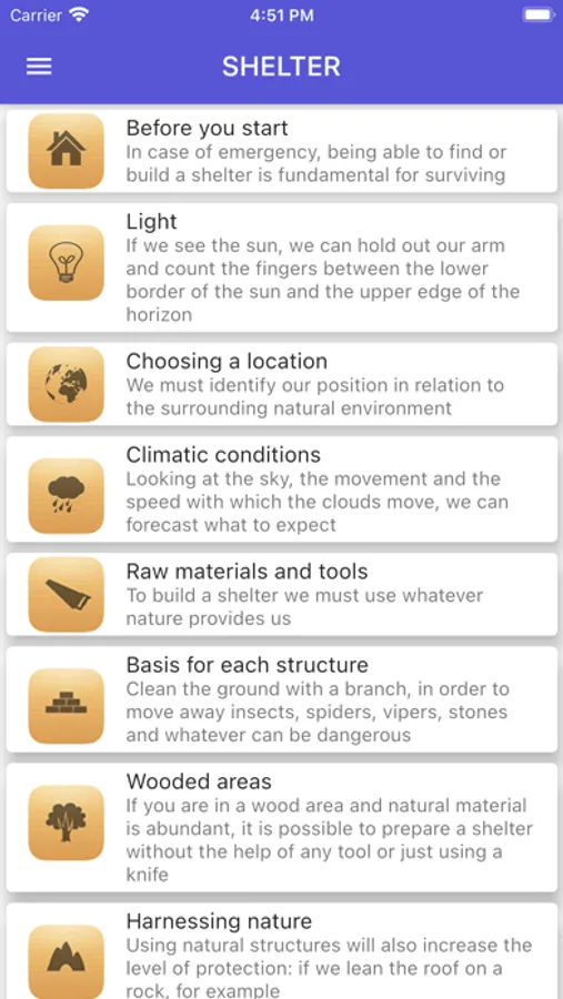 Application is a structure following 5 basic rules:will, shelter, fire, signaling, water and food.