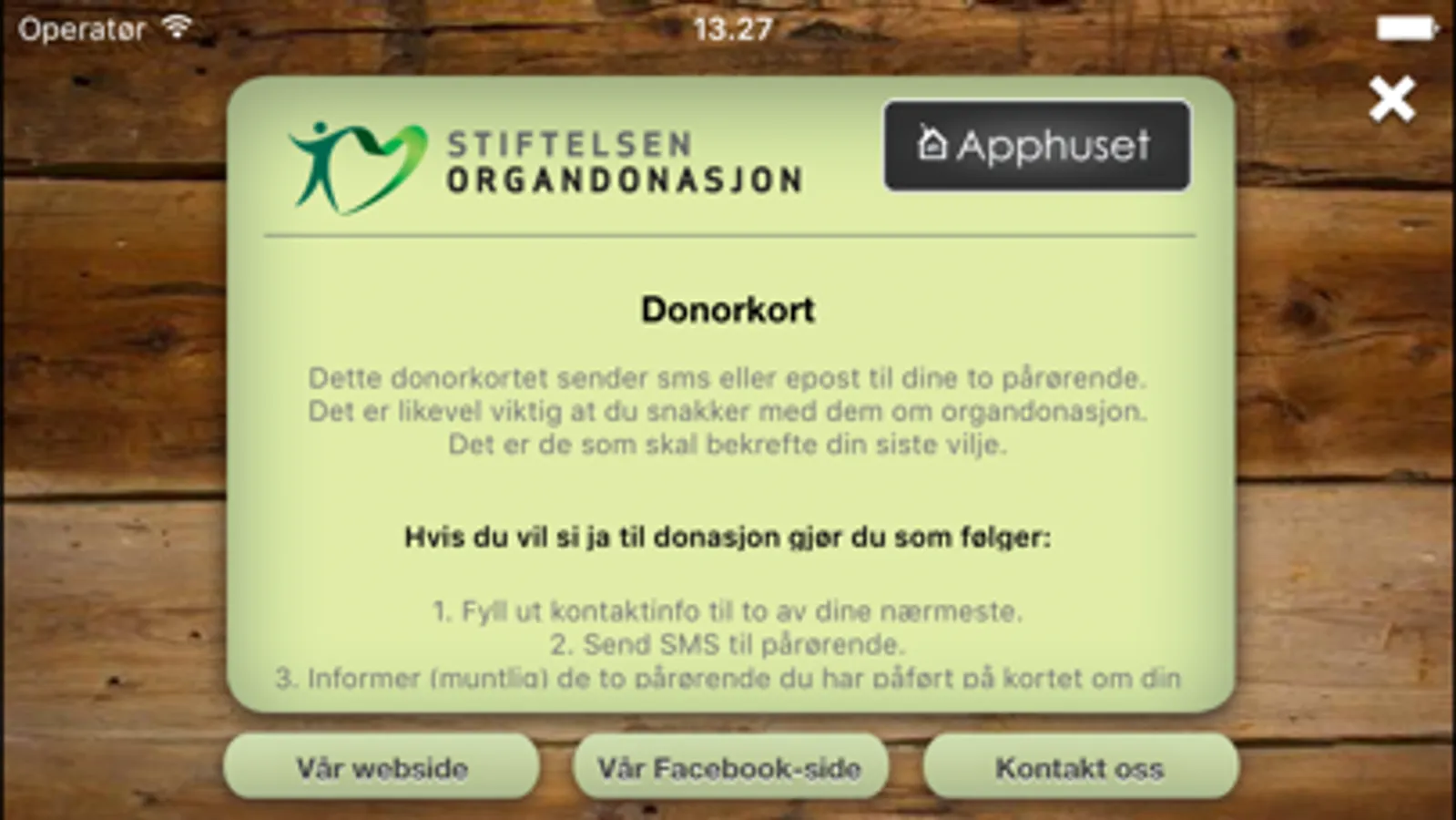 - Du kan legge ditt utfylte Donorkort™ på låst skjerm eller som widget. Se menyen i appen.
