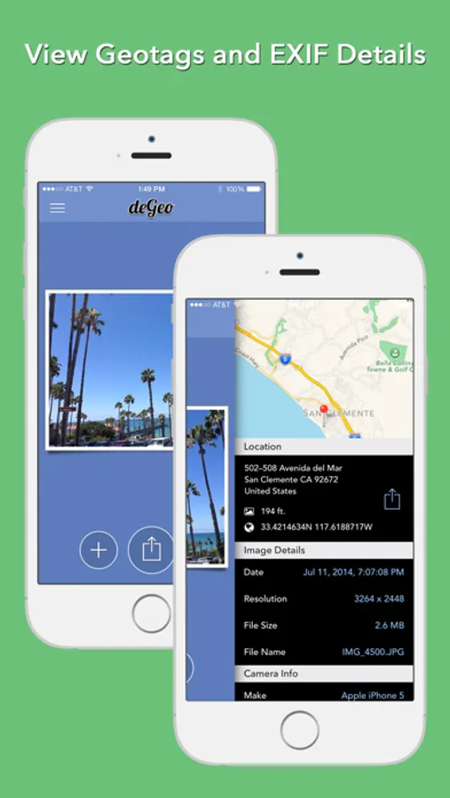 deGeo also exposes your geotags and the full Exif information. Swipe left to view the exact location your photo was taken on a map. Review the date and time of your snapshots as well as details about the camera, lens and exposure information. Don't need to share online? No problem you can also save deGeo'd copies of your photos for later use.