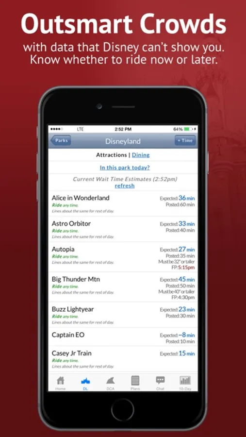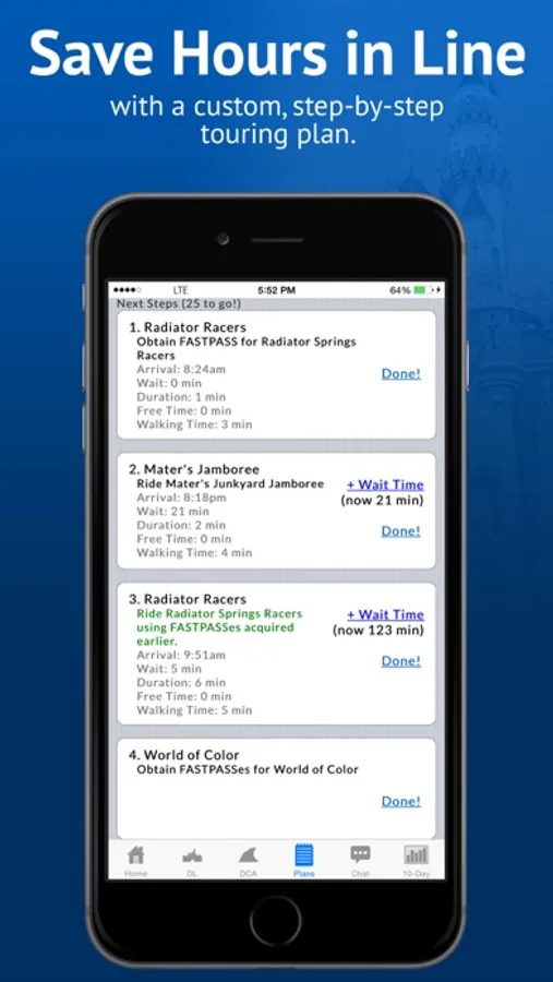 -Customized step-by-step touring plans for both Disneyland and Disney California Adventure. You tell LINES which rides you want to see, and LINES will create a step-by-step itinerary showing when to go to each ride to avoid long lines. You can even change your plans while you’re in the park!