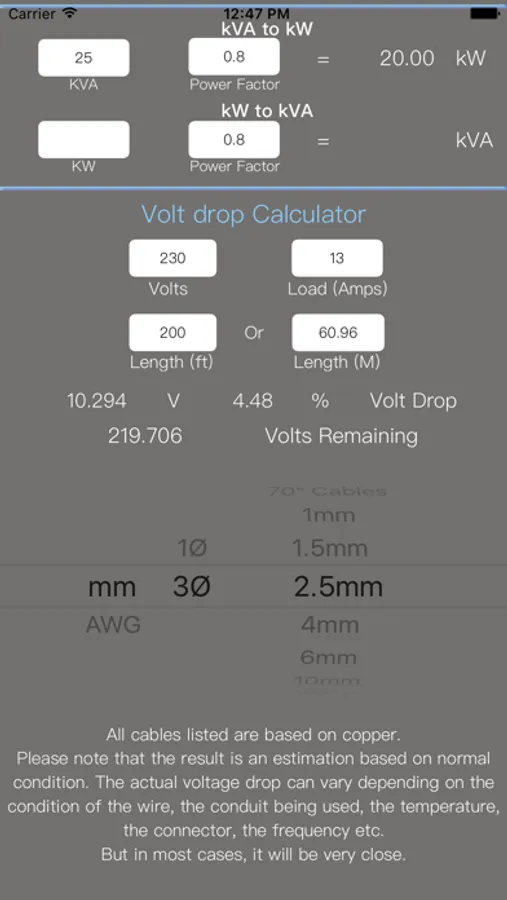 Electrical Formulas also has a Voltage Drop calculator and covers both mm2 and AWG cables for both single and three phase supplies.