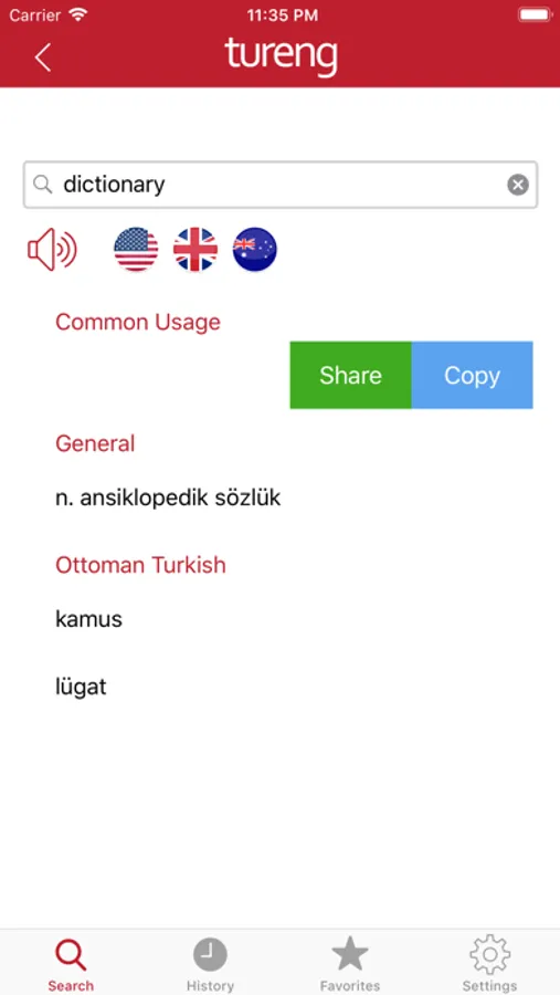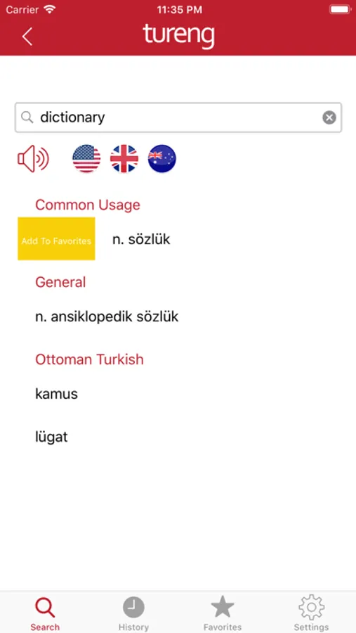 Having more than 3,000,000 English and Turkish words and phrases, classified into categories by the field of their usage, Tureng Dictionary, aiming to give the most accurate result in the fastest way, now provides the users with audial pronunciation option to hear the terms searched in the dictionary in three different accents, British, American and Australian.