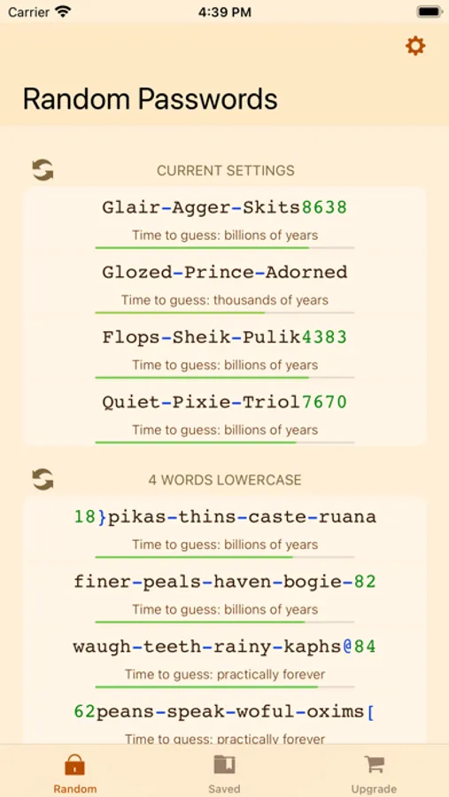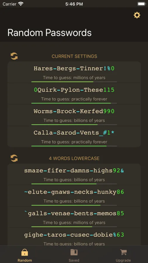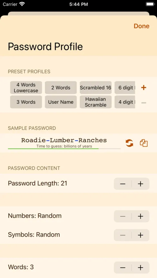 RPG includes the option for words in passwords! Now you can easily generate passwords like “~Turfy9CookedSambur” which are really easy to type and remember compared to "Cp7`KXmUoXEBHQ” and provide nearly the same level of password quality thanks to their length and composition. Turn this on by enabling the "Words" option in Settings.