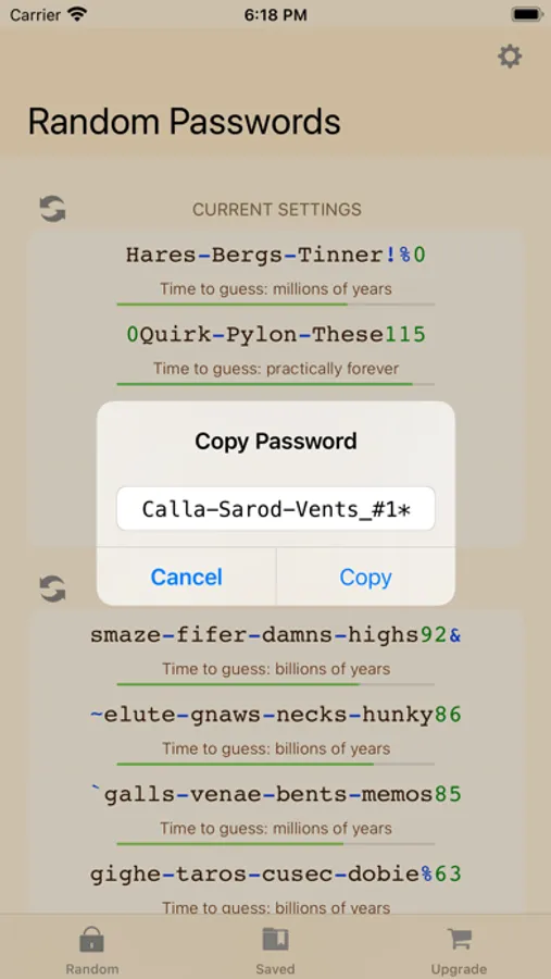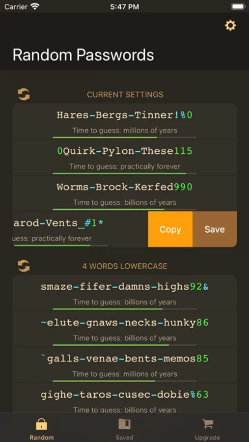 You can swipe to copy or save the password, or touch a password to tweak it before copying it for easy pasting later. Use the refresh buttons or pull the list down to generate more passwords.