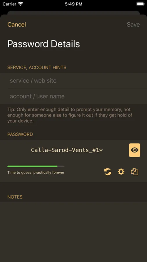 Password strength is measured for each password based on the complexity and variety of letters, numbers, and symbols included in the password. Time to guess is estimated based on a hypothetical computer system capable of making 500 billion guesses per second. Password Entropy is also available for each password (enable in Settings).