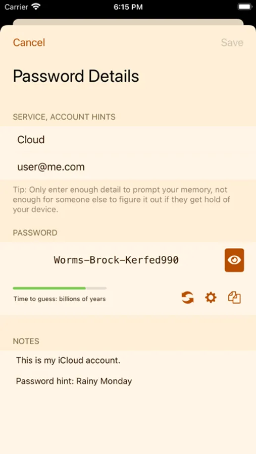 Several passwords are generated at the same time, so there is no way the app or the person watching over your shoulder could know which password you decide to use! Just memorize the password you like and your secret will be safe.