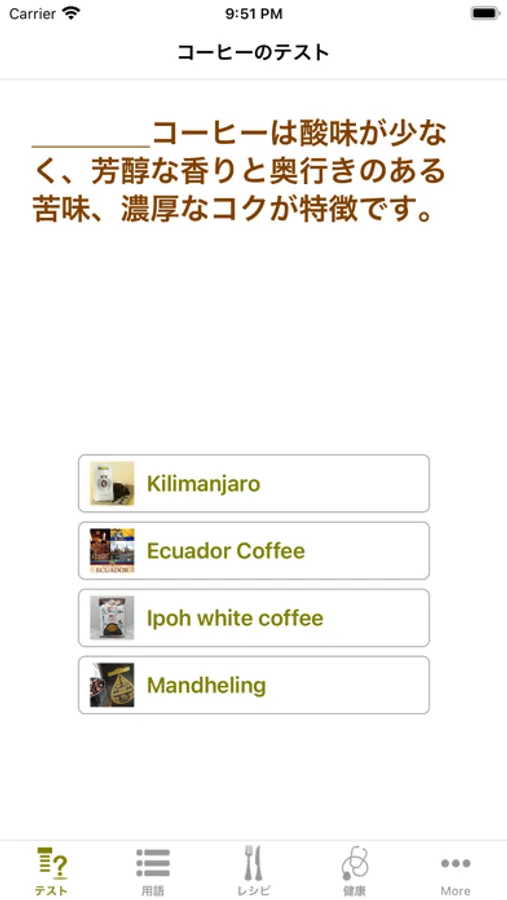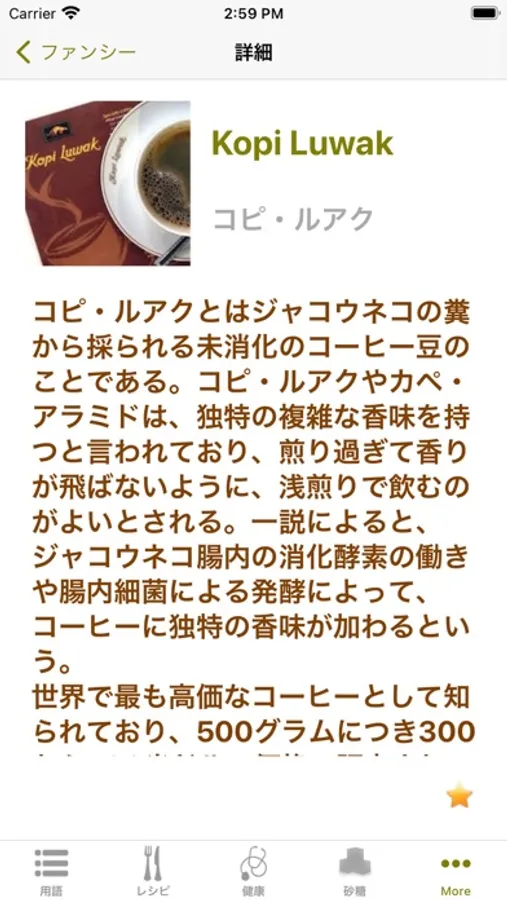 本アプリはコーヒーの用語、作り方、健康、砂糖、飲料、シングルオリジンコーヒーとファンシーコーヒーなどの知識を紹介しております。
