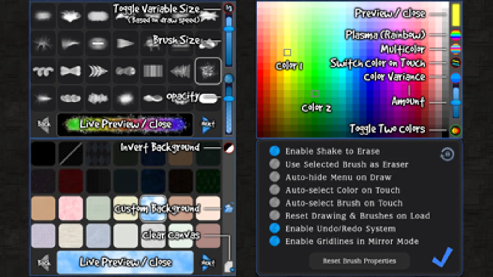 Scribblify comes packed with 140 hand crafted brushes unlike anything seen before, each with its own unique appearance and behavior. The huge selection of exclusive brushes, kaleidoscope and mirror drawing modes, advanced color effects, preset backgrounds and more ensures endless entertainment for all ages.