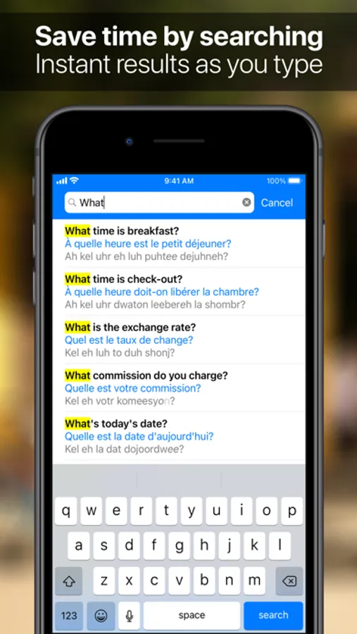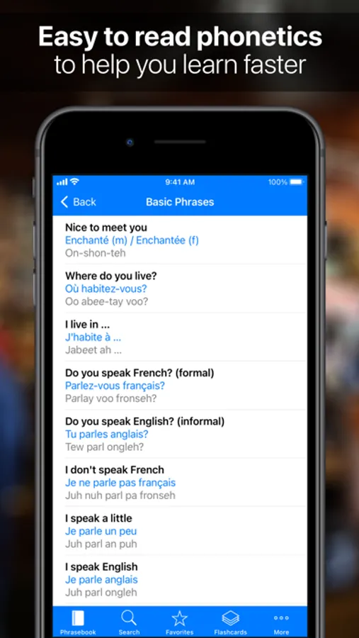 • Over 1,000 essential travel phrases with both French and phonetic translations plus audio.