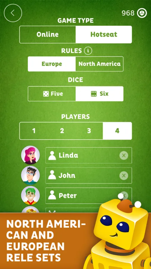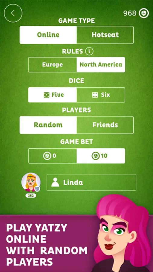 Play Yatzy™ online with random players or with family and friends. Supports both North American and European rule sets, as well as 5 or 6 dice. Yatzy™ allows up to 4 players online and offline and includes bots to play against AI. Join the fun online by playing random players and show you are the best at Yatzy™! Interact with other players in-game with fun emojis and phrases to add excitement to the game!