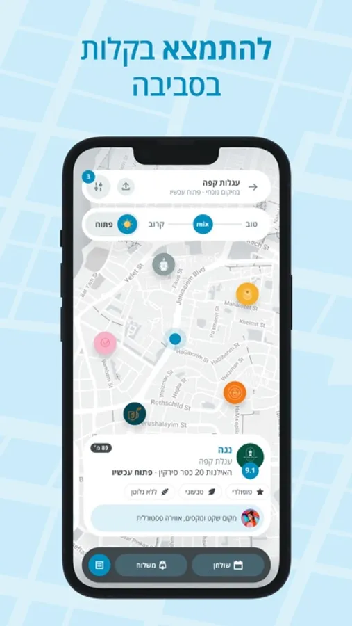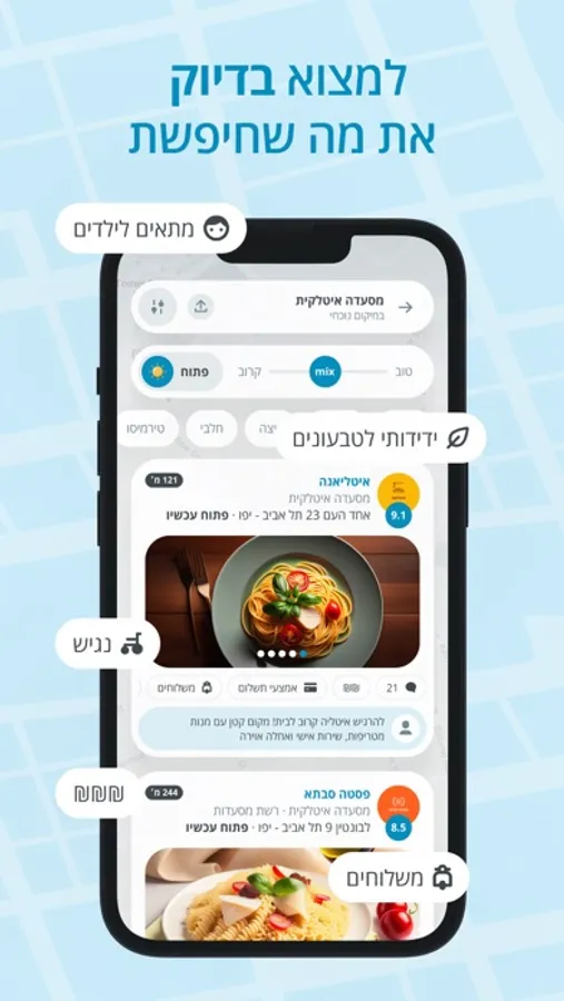 מערכת החיפוש המתקדמת של איזי מבוססת מיקום ומורכבת מאלפי קטגוריות ואפשרויות פילטור שעוזרים לך למצוא בדיוק את העסק שחיפשת עם כל הפרטים הנחוצים. את התוצאות ניתן לסדר בעזרת הסליידר לפי מה שטוב ו/או מה שקרוב. רוצה לנסות?