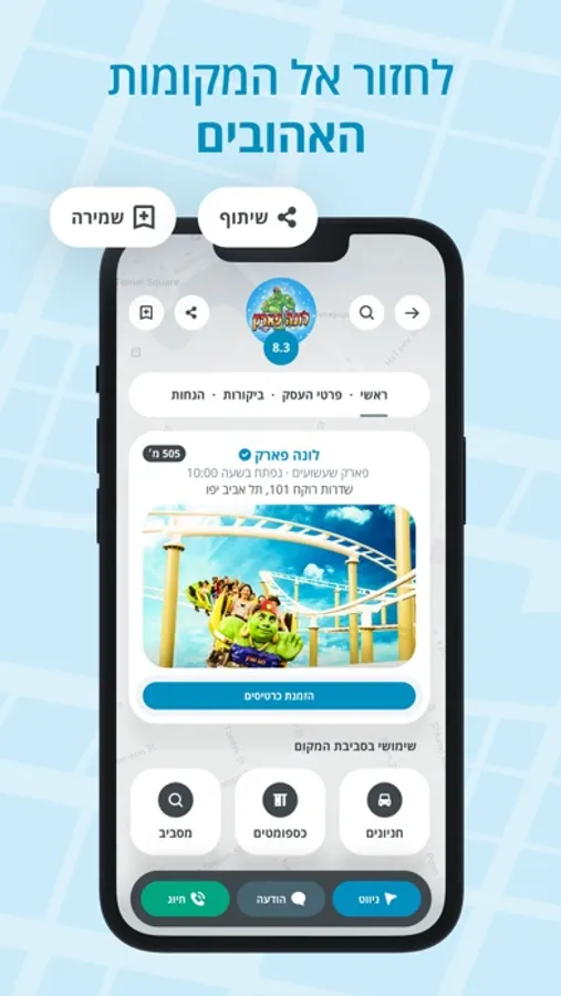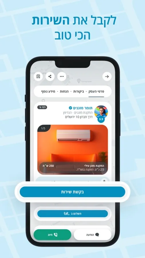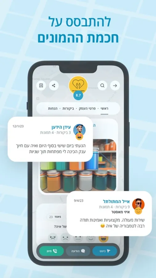 באיזי אפשר למצוא את כל הפרטים על עסקים בישראל! כתובות, טלפונים, שעות פתיחה, תמונות, ביקורות גולשים ומומחים, מחירונים ועוד! מצאת עסק מתאים? אפשר ליצור איתו קשר בטלפון או באמצעות הצ'אט באפליקציה, לנווט ליעד בקלות, להזמין מקום ועוד שלל אפשרויות.