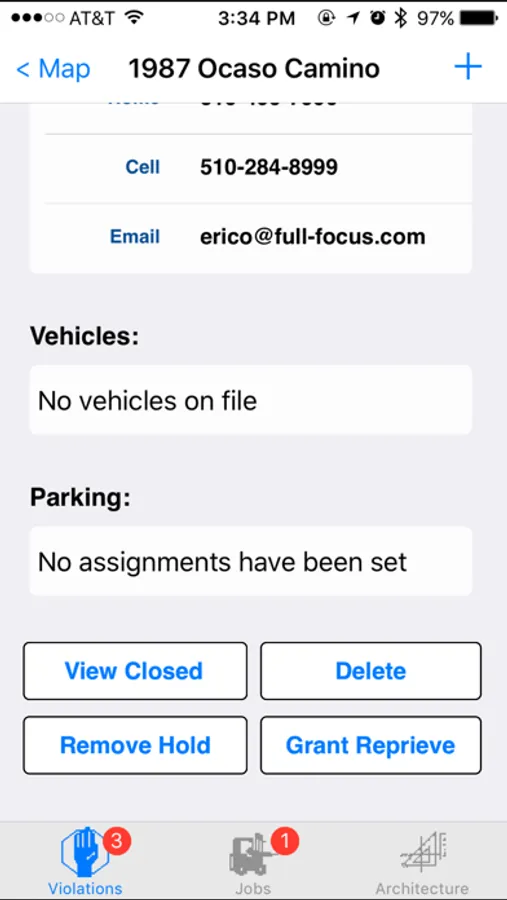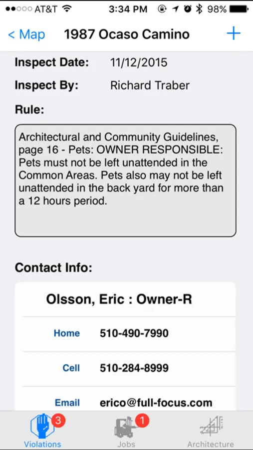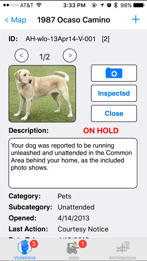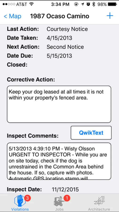 -One tap on a pending record puts All information you need for follow-up action decisions at your fingertip: date originally opened, photo, description, corrective action (Violations only), follow-up action required, full inspection history and comments, applicable CC&R Rule text.