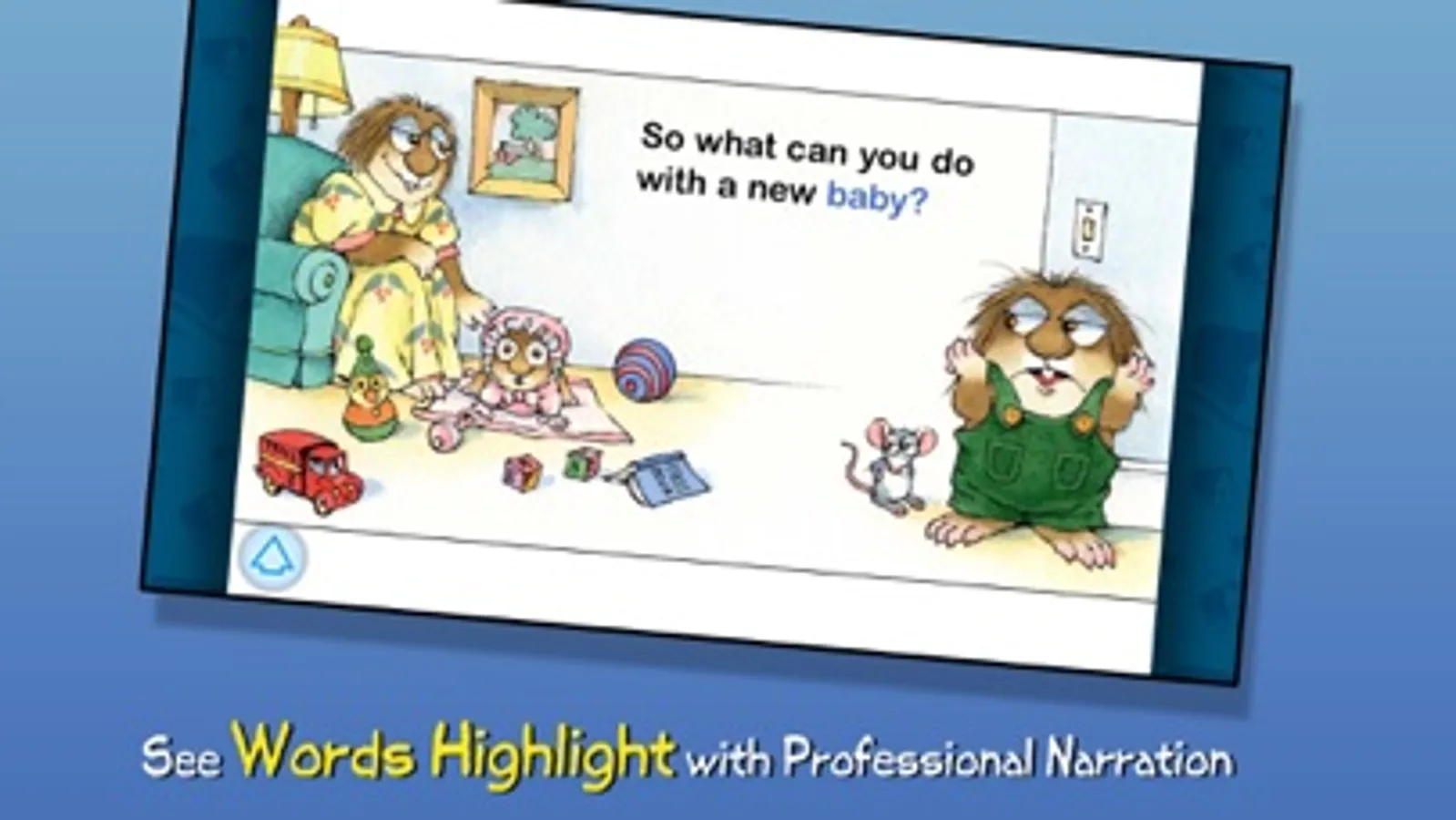 Join Little Critter in this interactive book app as he gets used to his new baby sister! Explore pictures, learn new vocabulary, and personalize the story with your own narration. How will Little Critter learn how to be a good brother? Jump inside to find out!